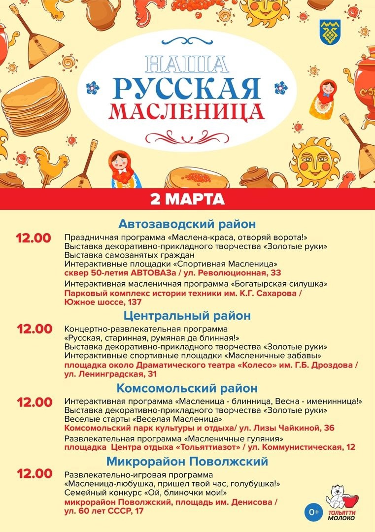 Тольяттинцев приглашают на общегородские мероприятия в рамках празднования Масленицы. Они пройдут 1 и 2 марта во всех районах города.