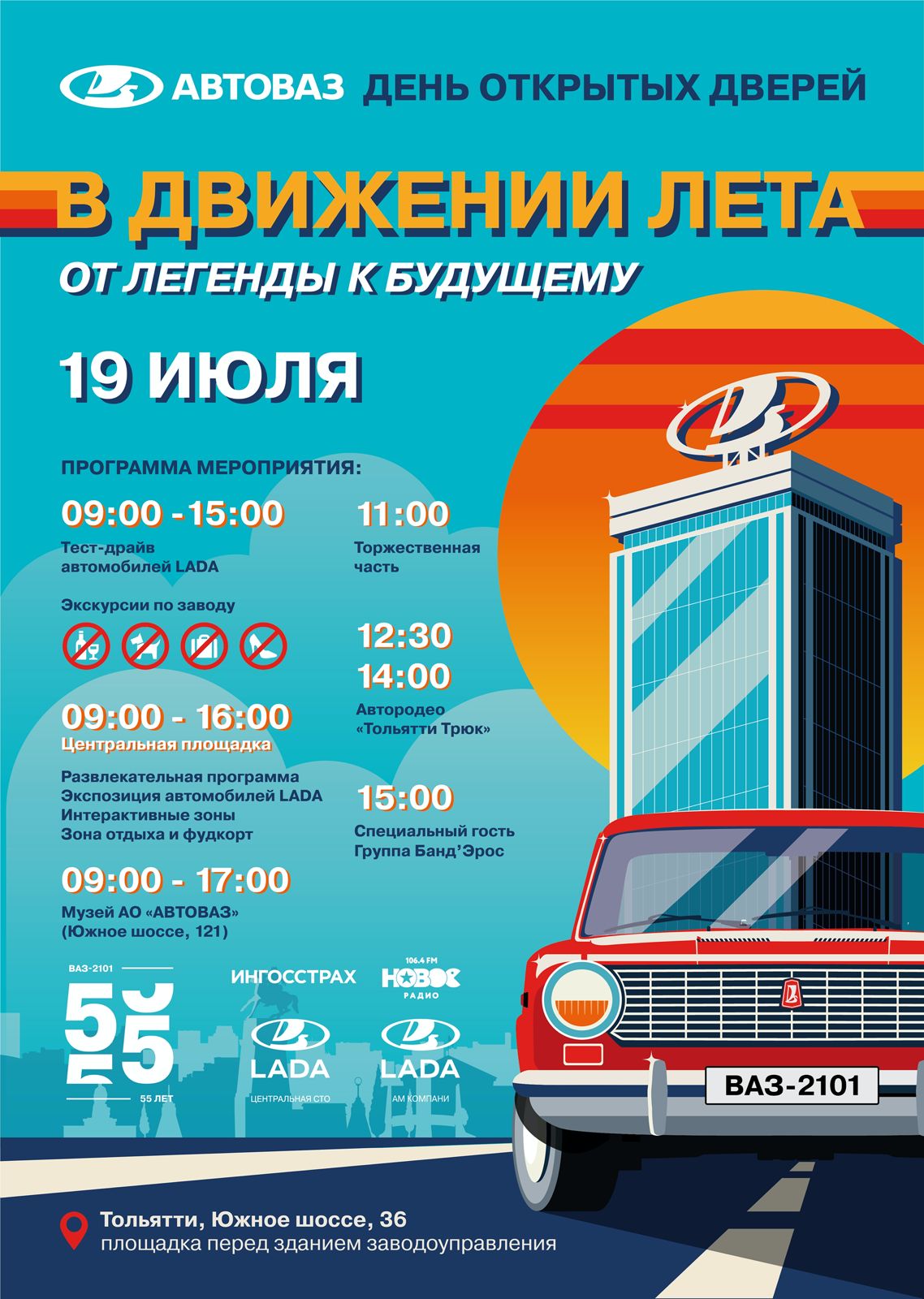 19 июля АВТОВАЗ открывает свои двери и приглашает всех желающих на празднование 59-го Дня рождения. Гостей ждут занимательные экскурсии по заводу, тест-драйвы популярных моделей автомобилей, развлекательная шоу-программа, яркий концерт и масса положительных эмоций.