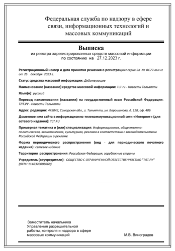 Регистрационный номер и дата принятия решения о регистрации: серия Эл № ФС77-86472 от 26 декабря 2023 г.