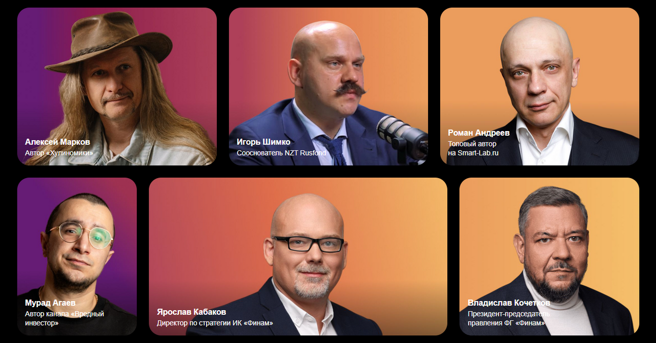 Среди спикеров мероприятия — автор «Хулиномики» Алексей Марков, трейдер Роман Андреев, представители команд NZT Rusfond и Mozgovik Research, авторы стратегий сервиса «Финам Автоследование» Алексей Бачеров и Сергей Трофимов, соавтор канала «Вредный инвестор» Мурад Агаев и главный редактор портала Finversia.ru Ян Арт. Модераторами выступят ведущие РБК Анна Кожухарь и Никита Макаров, а также практикующие трейдеры.