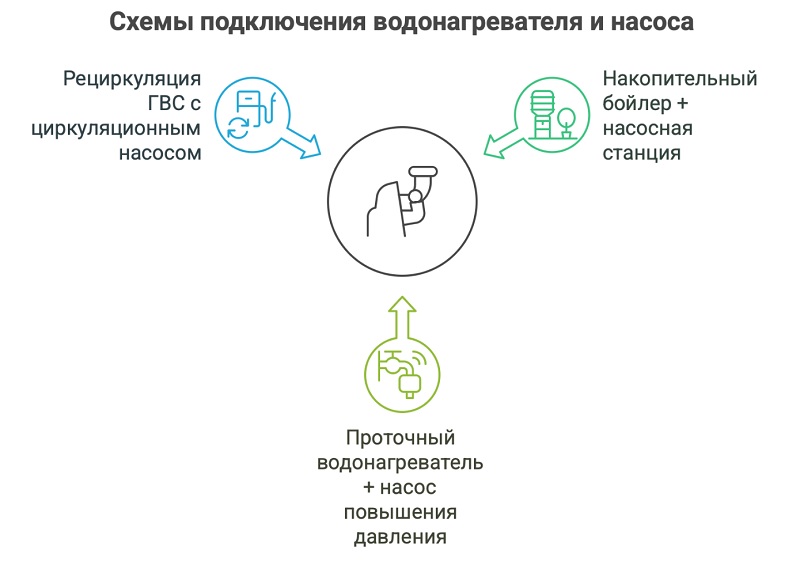 Схема выбирается от источника воды и сценария пользования. Для автономного водоснабжения — станция + накопительный бойлер; для городской сети — проточник + насос повышения давления; для мгновенной подачи горячей воды в большом доме — рециркуляция с циркуляционным насосом.