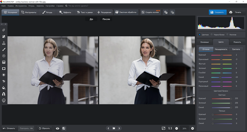 Для решения этих задач отлично подойдет программа ФотоМАСТЕР. В ней можно быстро настроить тон и контрастность, привести серию снимков к единому формату через пакетные опции — кадрирование и стилизацию. Ручное и умное удаление фона позволяет заменить задний план. При помощи встроенных ИИ-пресетов можно улучшить портрет и нанести макияж в один клик.
