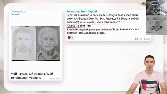И все же решила воспользоваться возможностью пройти бесплатный марафон, и совершенно не разочаровалась. Даже первое занятие вдохновило. Понравилось, как легко Егор Матита объясняет, казалось бы, сложные вещи. Плюс потом увидела отзывы учеников с крутыми рисунками – тех, кто уже прошли обучение в школе «Арт-Матита». Причем многие ученики в отзывах говорят, что до курса Егора Матита никогда не рисовали. Собственно, это и стало решающим фактором.