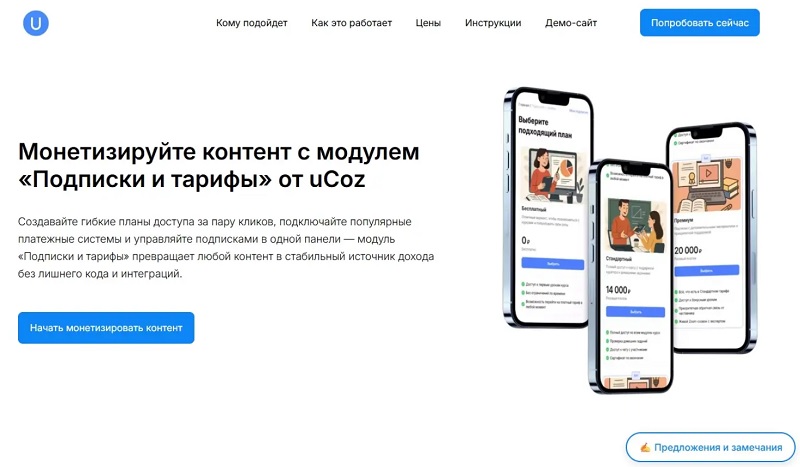 uCoz постепенно превращается из классического «конструктора сайтов» в полноценную платформу для монетизации знаний и творчества. Сегодня это не просто инструмент для создания сайта, а комплексное решение, позволяющее продавать инфопродукты, собирать донаты и строить подписные модели без привлечения сторонних сервисов. Платформа особенно подойдет авторам инфопродуктов, коучам, блогерам и некоммерческим организациям, которые хотят развивать свои проекты онлайн и получать стабильный доход. Новый модуль «Подписки и тарифы» делает запуск собственного платного сообщества доступным каждому, открывая возможности для создания клубов, образовательных платформ и авторских медиа без сложных технических настроек.