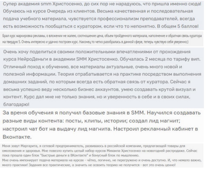 И все же положительных отзывов об Академии Михаила Христосенко гораздо больше. В них студенты пишут, что Михаил дает четкие инструкции о том, как организовать стабильный доход при помощи социальных сетей. Многим прилежным ученикам удалось обрести новых заказчиков и увеличить продажи уже во время прохождения курса.