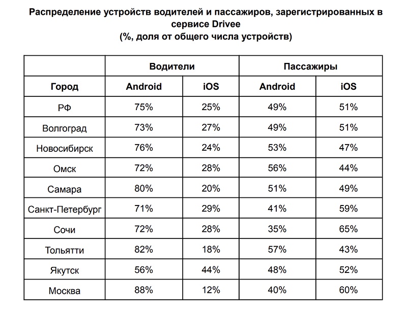 Не менее интересным стал цифровой портрет пользователей Drivee, который, по данным аналитиков, характеризуется значительными отличиями. На федеральном уровне в среднем 75% водителей, зарегистрированных в сервисе, используют смартфоны на базе Android, в то время как в пассажирском сегменте обратная ситуация – доля iOS достигла 51%. В Тольятти ситуация немного отличается, не только водители отдают предпочтение устройствам на Android, но и, с незначительным перевесом, пассажиры.