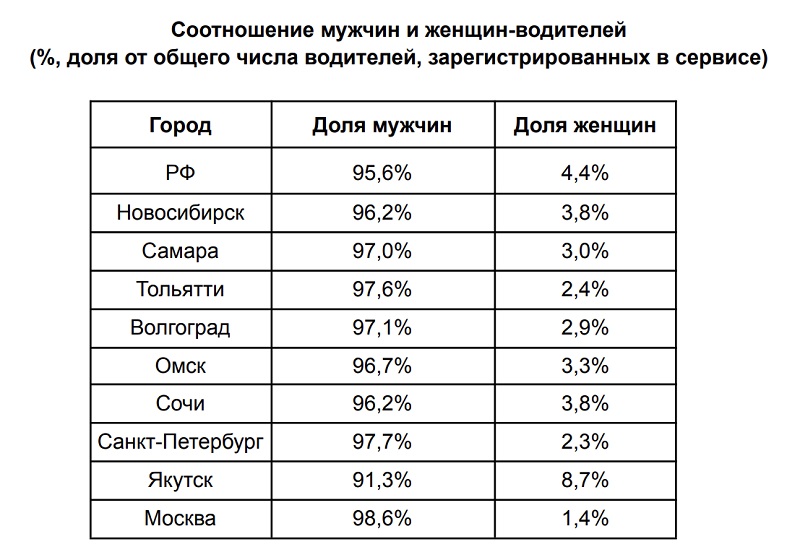 Согласно данным исследования, на сегодняшний день рынок такси по-прежнему остается преимущественно мужским: в целом по стране 95,6% зарегистрированных в сервисе водителей — мужчины, и только 4,4% — женщины. В Тольятти эти цифры составляют 97,6% и 2,4% соответственно.