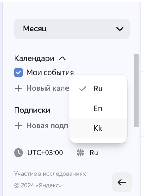 Интерфейс Календаря теперь доступен на трех языках. К традиционным русскому и английскому языкам добавили казахский. Изменить настройку можно в левом нижнем углу экрана: иконка для этого находится рядом с обозначением часового пояса. Теперь иностранные пользователи имеют больше возможностей для работы с сервисом на языке, который им удобен.