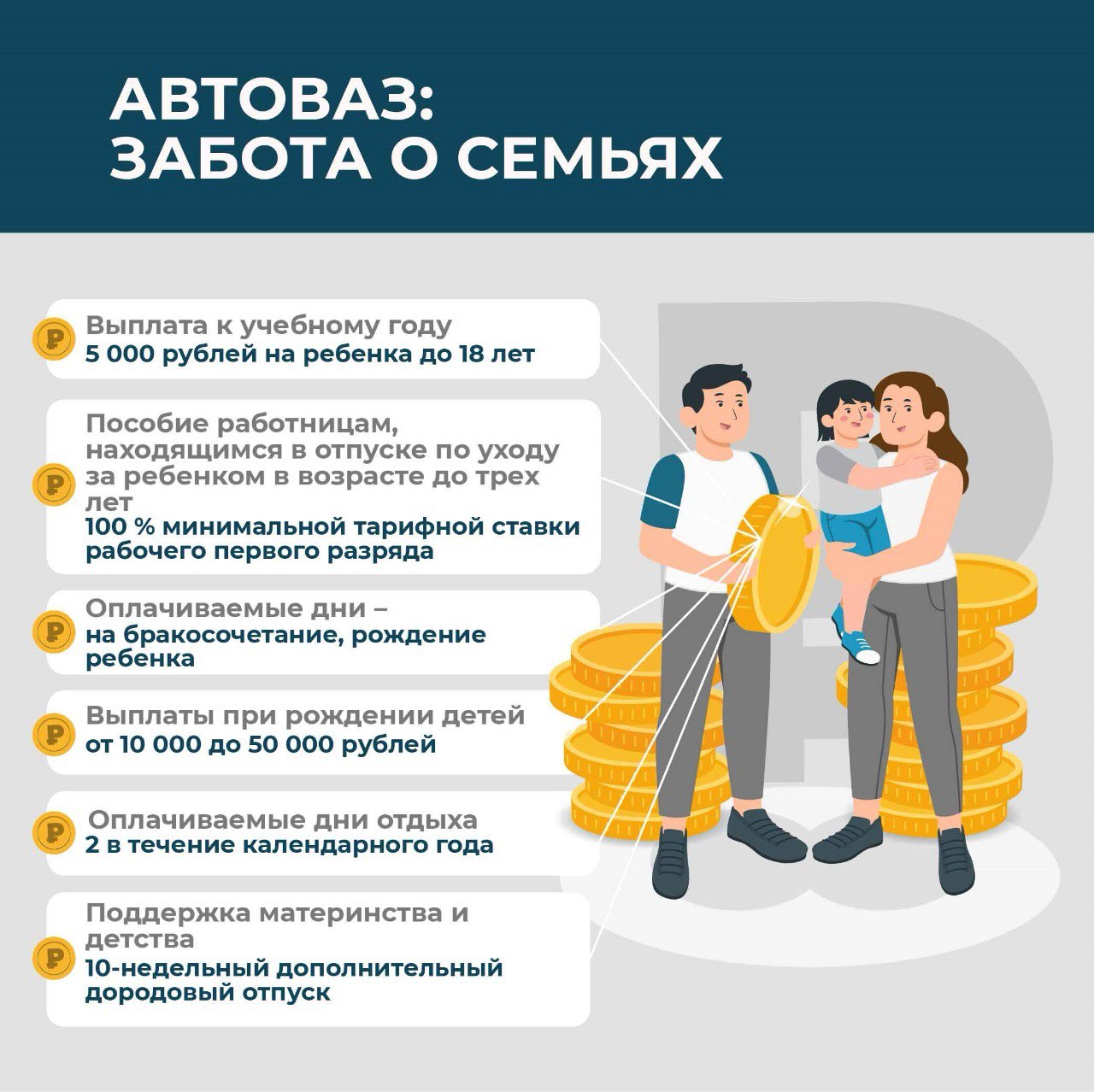 Совершенно новым пунктом коллективного договора АВТОВАЗа стало вступившее в действие с 1 января 2025 года обязательство о денежных выплатах при рождении детей работников. Так, при появлении на свет первого ребенка семья заводчан получит 10 тысяч рублей. При рождении второго малыша эта сумма составит уже 20 тысяч рублей. При пополнении третьим ребенком полагается выплата в 30 тысяч рублей. Появление на свет четвертого малыша принесет в семью 40 тысяч рублей. При рождении пятого и каждого последующего ребенка сумма выплаты составит 50 тысяч рублей.