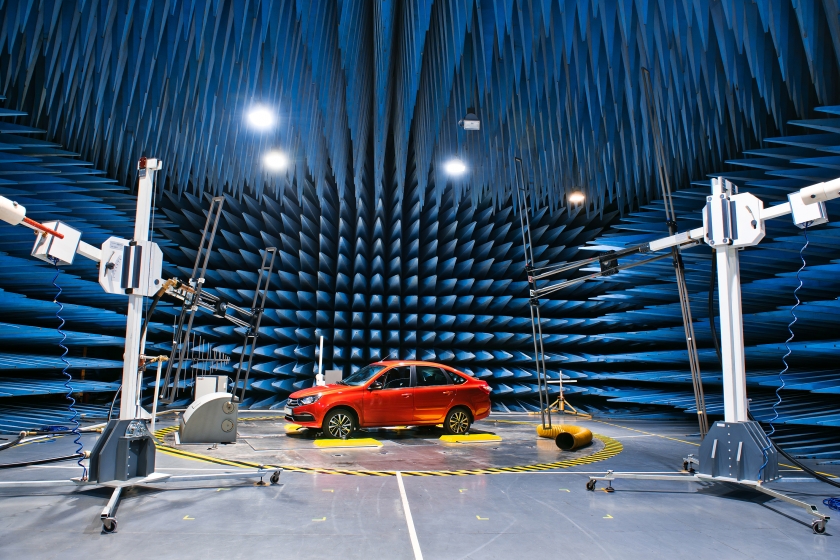 Камера испытаний на электромагнитную совместимость: здесь проверяют и совершенствуют электрооборудование автомобилей. В лаборатории электромагнитной совместимости АВТОВАЗа действует экранированная безэховая камера – одна из самых больших в мире, что позволяет вести исследования в широком диапазоне волн. Стены камеры покрыты пирамидами-абсорберами, которые гасят и звуки, и электромагнитные волны. В лаборатории возможна имитация электромагнитных полей практически от любых существующих источников, от сотовых телефонов, до высоковольтной ЛЭП.