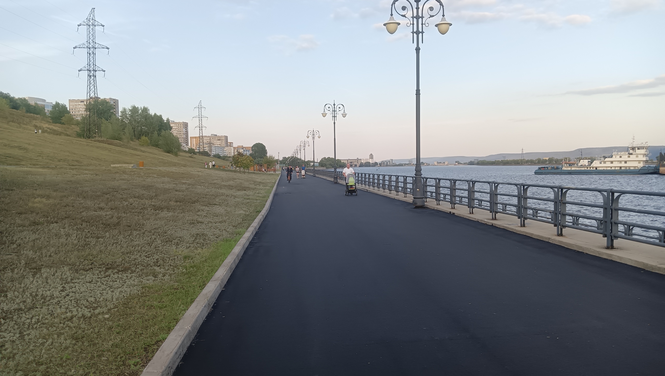 Кроме нового асфальта, на набережной Комсомольского района уложена брусчатка, а на смотровой площадке появились новые перголы с диванами и урны.