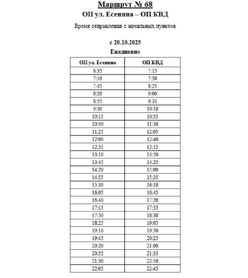 Маршрут будет начинать работу в 6:35 от ОП на ул. Есенина. Последний рейс будет отправляться в 22:45 от ОП КВД. В администрации города опубликовали время отправления автобусов с начальных пунктов.