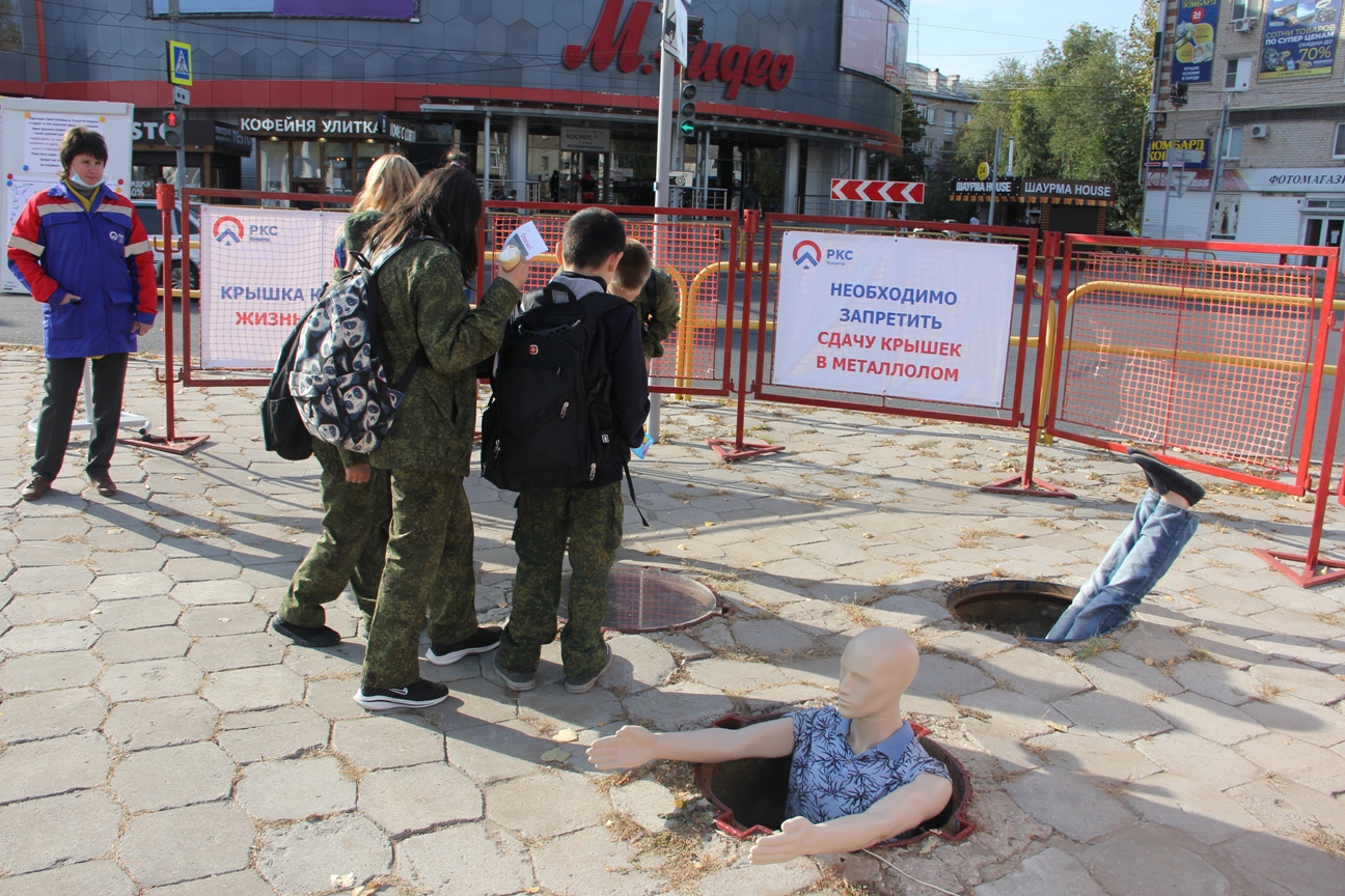 В Тольятти у входа в Центральный парк состоялась акция «Загляни в колодец». Специально для жителей сотрудники «РКС-Тольятти» подготовили наглядную композицию – что может произойти с теми, кто наступает на инженерные колодцы.