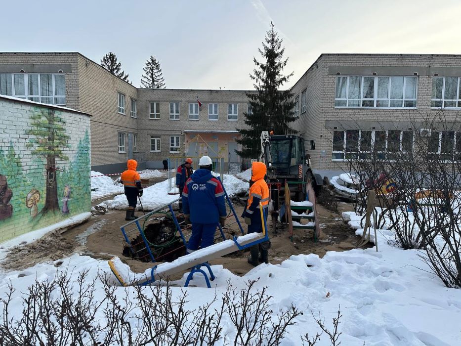 В детском саду произошел технологический отказ на сети водоснабжения на вводе в здание. Стремительно хлынувший поток воды мгновенно затопил территорию.
