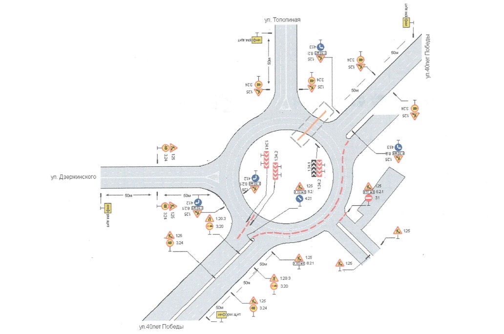 На время производства работ первого этапа меняется схема движения по кольцевой развязке 40 лет Победы/Тополиная/Дзержинского согласно опубликованной схеме. Водителей просят заранее выбирать пути объезда.