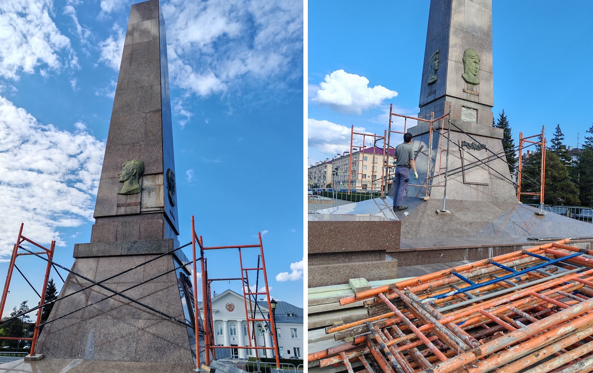 В Центральном районе стартовал ремонт обелиска Славы на площади Свободы. Работы проводятся по муниципальной программе благоустройства.