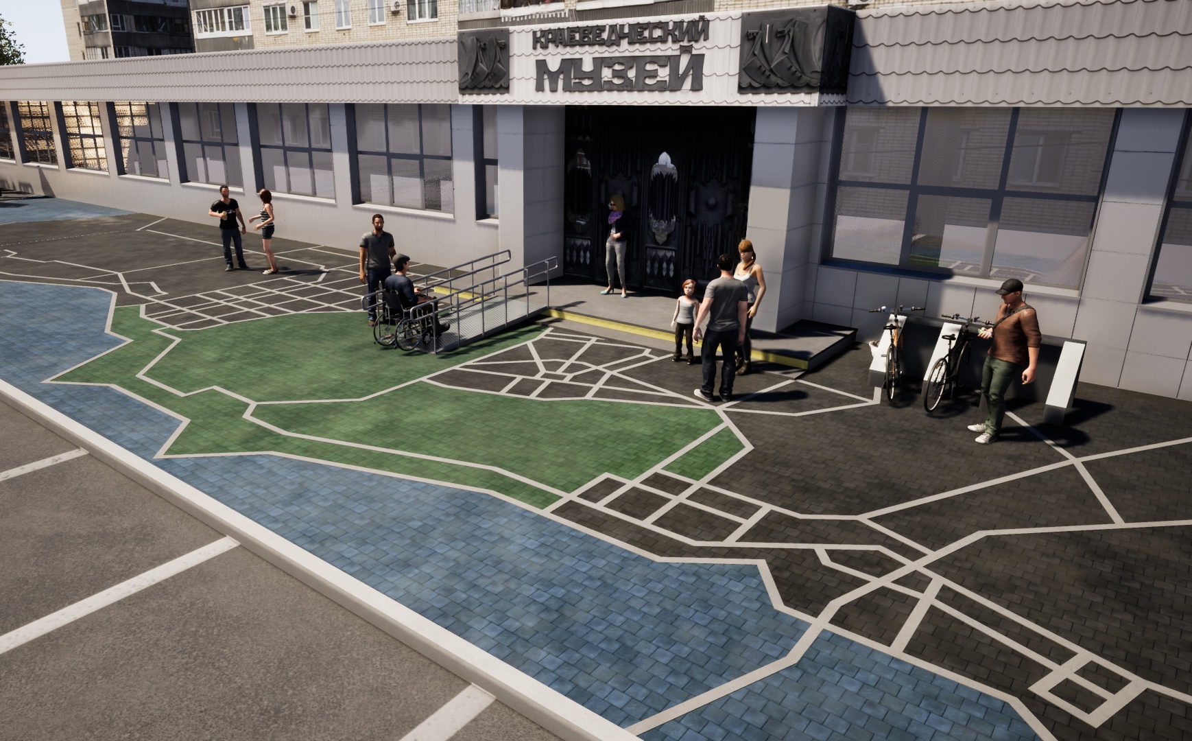 Как рассказали авторы проекта, перед музейным крыльцом появится карта города, вымощенная разноцветной тротуарной плиткой. Это позволит ярко обозначить вход в музей, а само крыльцо будет облицовано стойкими к внешним воздействиям противоскользящими гранитными плитами.