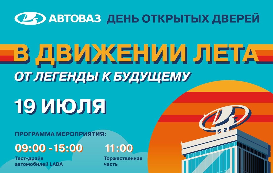 19 июля АВТОВАЗ открывает свои двери и приглашает всех желающих на празднование 59-го Дня рождения. Гостей ждут занимательные экскурсии по заводу, тест-драйвы популярных моделей автомобилей, развлекательная шоу-программа, яркий концерт и масса положительных эмоций.