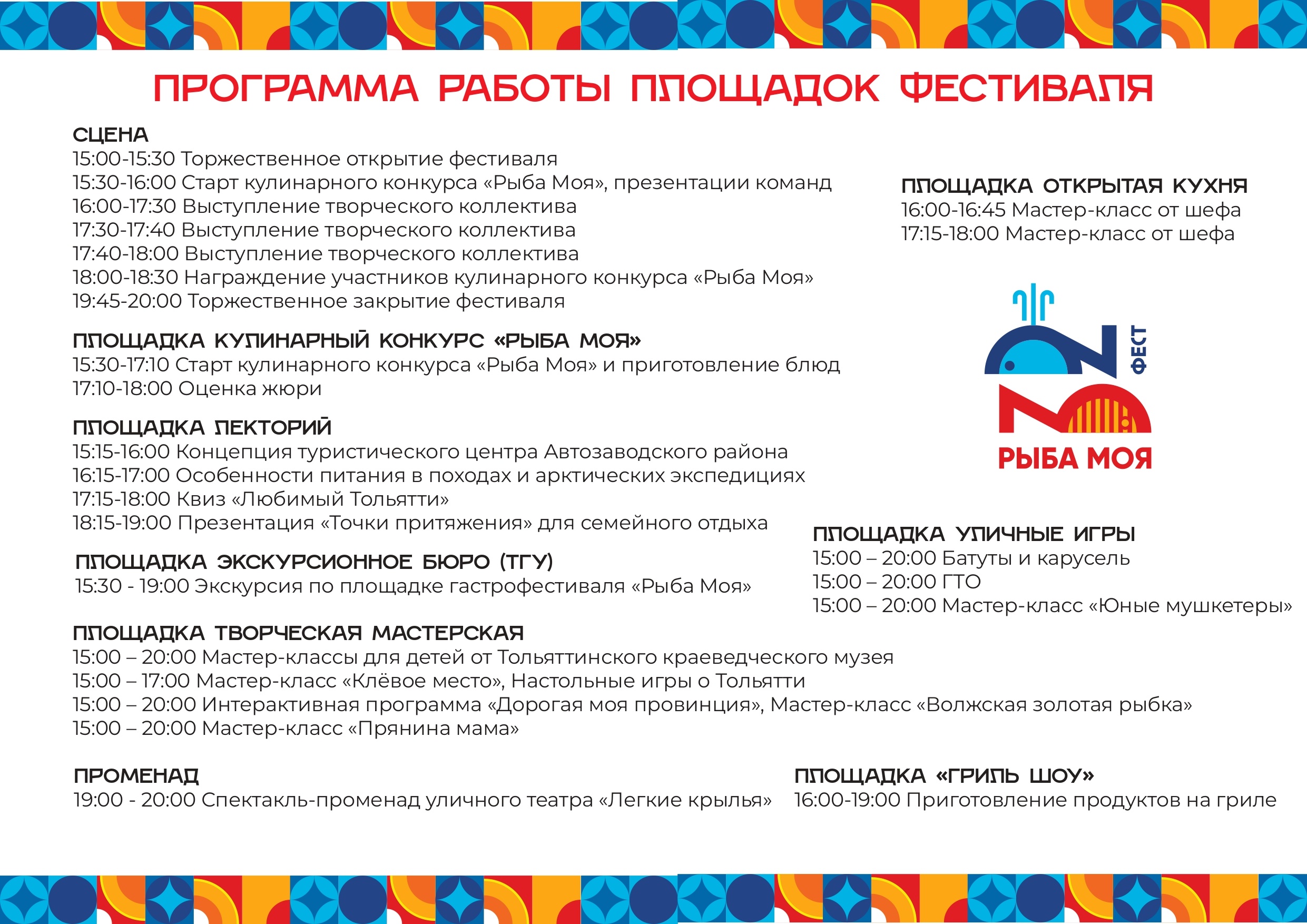 Администрация Тольятти опубликовала подробную программу фестиваля. Волжская кухня, рыбные изысканные блюда, мастер-классы, лектории, экскурсии, интерактивы, спектакль-променад – все это ждет гостей мероприятия.
