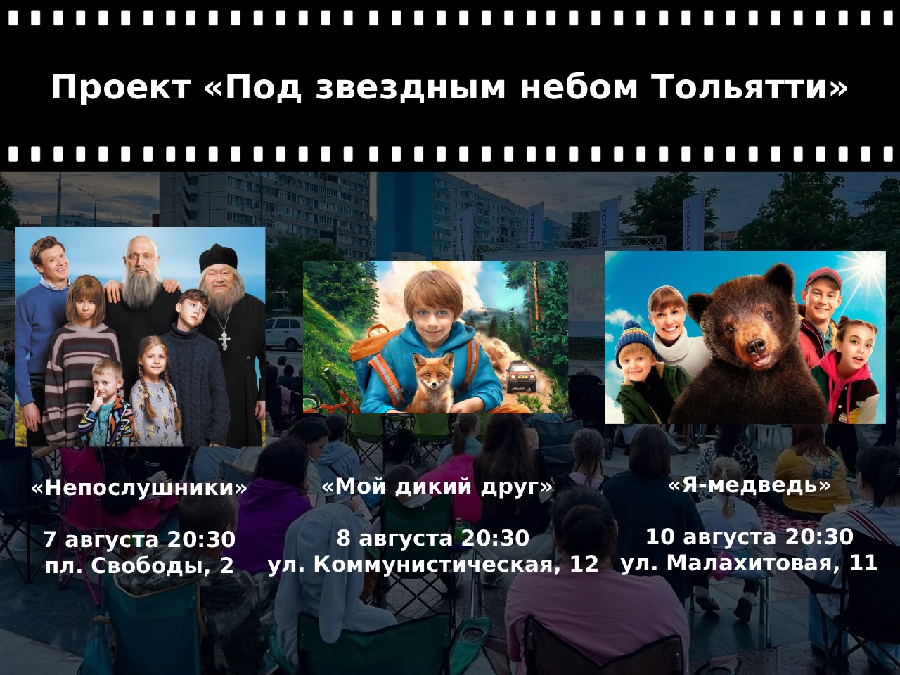 8 августа в 20:30 на площадке ЦО «Тольяттиазот» (ул. Коммунистическая, 12) покажут «Мой дикий друг» (2024, 6+, 1 ч 40 мин, Россия, приключения). Семиклассник Саша Меньшиков заканчивает учебный год в новой школе и живёт со своей тётей Ниной в маленьком живописном городке. Мама Саши, известный учёный, на время своей очередной экспедиции привезла его сюда из Москвы. С одноклассниками у Саши не заладилось, после школы он часто в одиночестве гуляет на природе. Однажды в лесу Саша находит маленького лисёнка, попавшего в капкан. Узнав, что за лисёнком охотятся браконьеры, мальчик прячет его в землянке в глубине леса и начинает выхаживать. С этого начинается трогательная и полная приключений история о дружбе, ответственности и справедливости.