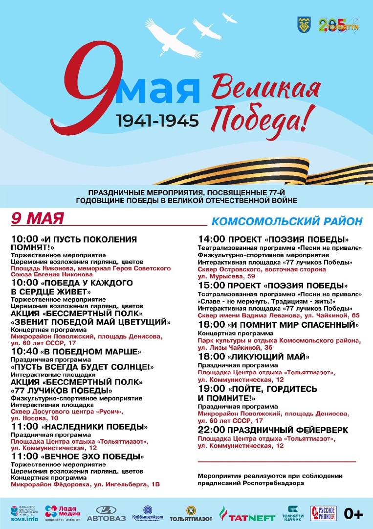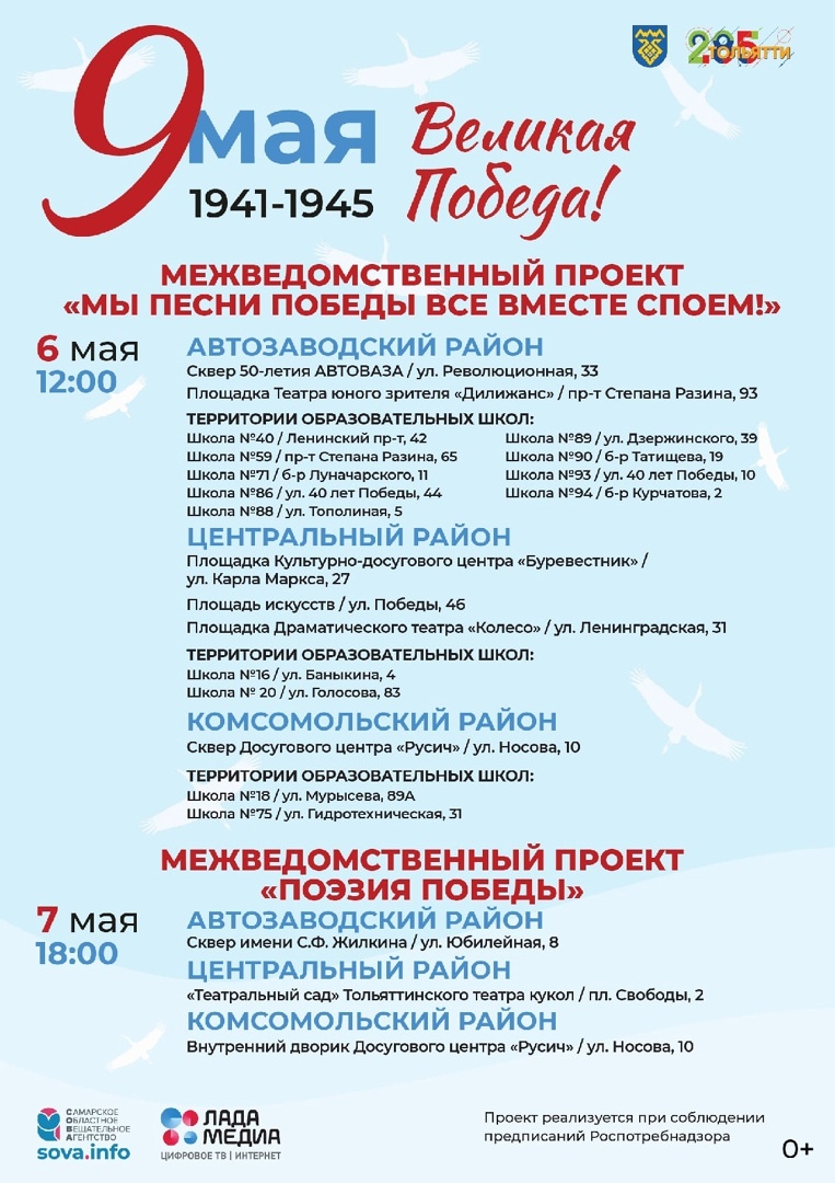 В ближайшие дни в Тольятти пройдут проекты «Поэзия Победы» и «Мы песни Победы все вместе споем». Запланирована масса спортивных мероприятий. 9 мая во всех районах состоятся праздничные концерты, тематические мероприятия и выставки, по улицам города проедет автоколонна.