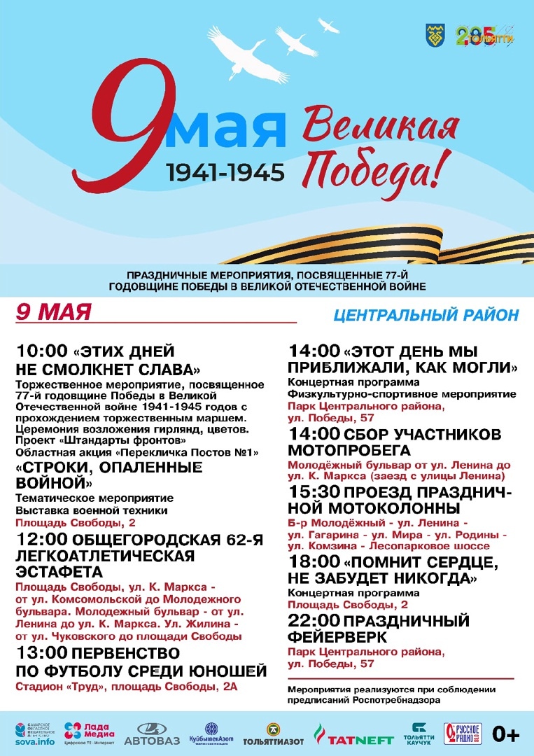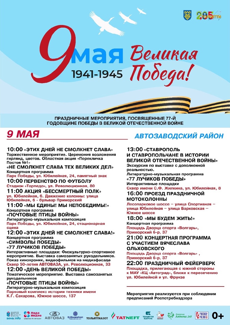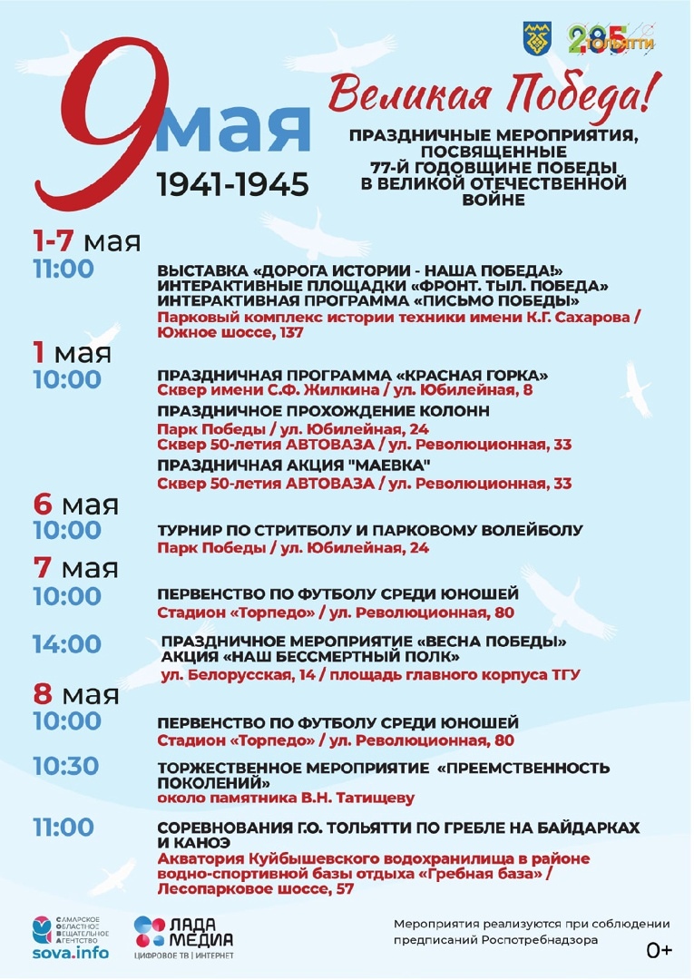 Тольятти отмечает 77-ю годовщину Великой Победы! В городе запланированы самые различные праздничные мероприятия – администрация опубликовала афишу