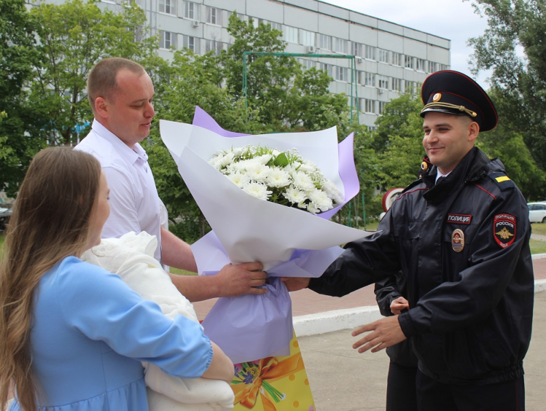 Сотрудники полиции совместно с представителем Общественного совета при Управлении МВД России по г. Тольятти Николаем Шаховым поздравили молодую семью с пополнением, вручили счастливым родителям цветы и памятный подарок.