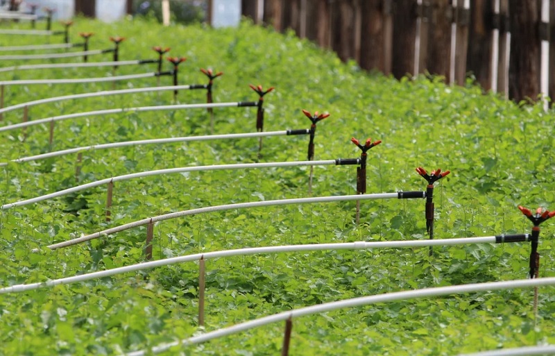 В питомнике обеспечен автоматический полив среднеструйными аппаратами. Полив производится рано утром, чтобы растения не получили ожоги. Также посевы затеняют от солнца специальными деревянными щитами.