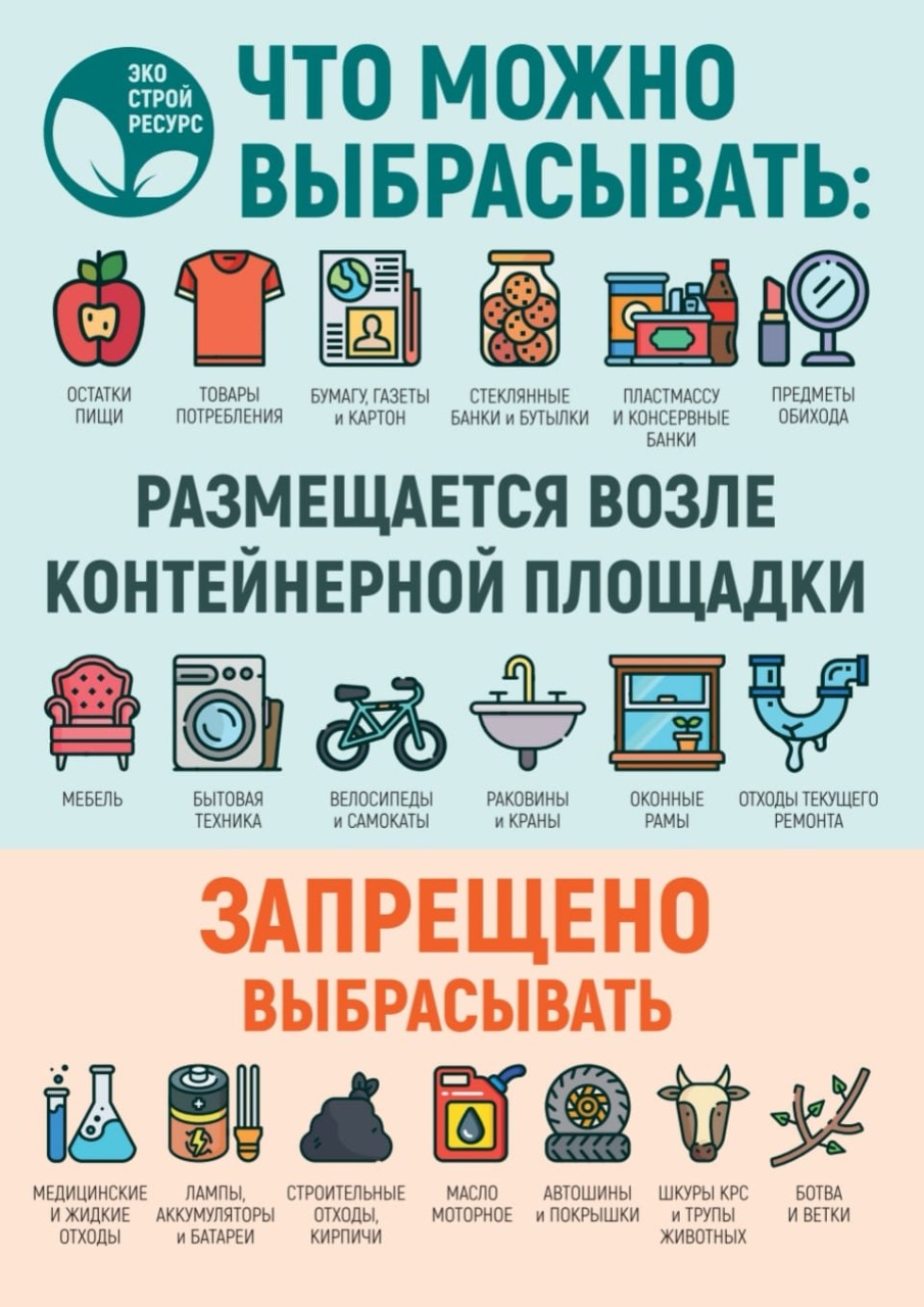 Контейнерные площадки предназначены для накопления твердых коммунальных отходов (ТКО). К ним относятся отходы, образованные в жилых помещениях в процессе потребления физическими лицами. В том числе и крупногабаритные отходы – мебель, бытовая техника, отходы от текущего ремонта жилья. Их необходимо складировать рядом с контейнерами на спец. площадке под КГО или в бункер. Вывоз крупногабаритных отходов регоператор осуществляет отдельной спецтехникой.