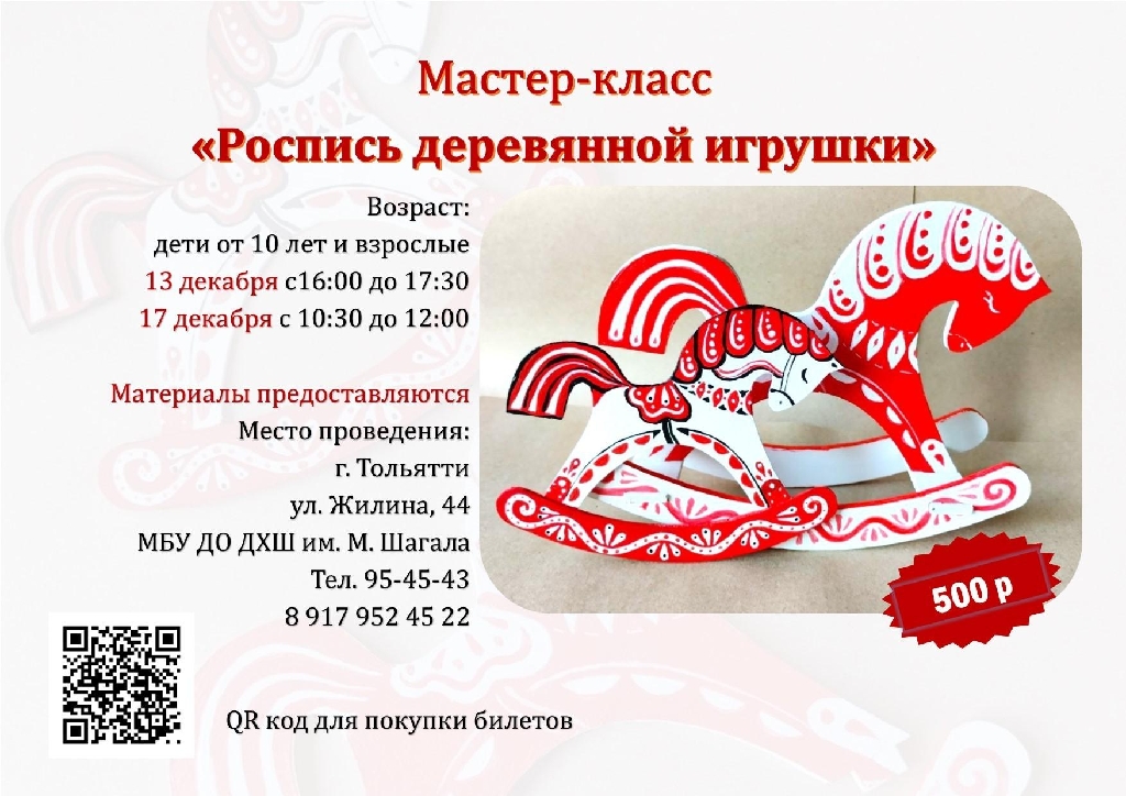 Детская художественная школа имени Марка Шагала приглашает всех желающих окунуться в мир творчества и искусства на увлекательном мероприятии по росписи деревянных игрушек! Мероприятие пройдет в уютной творческой атмосфере и позволит каждому участнику раскрыть свой творческий потенциал. Под руководством опытного мастера участники освоят традиционную технику росписи. Не упустите шанс проявить свою фантазию и создать уникальную деревянную игрушку, которая станет прекрасным украшением вашего дома или подарком близким людям!