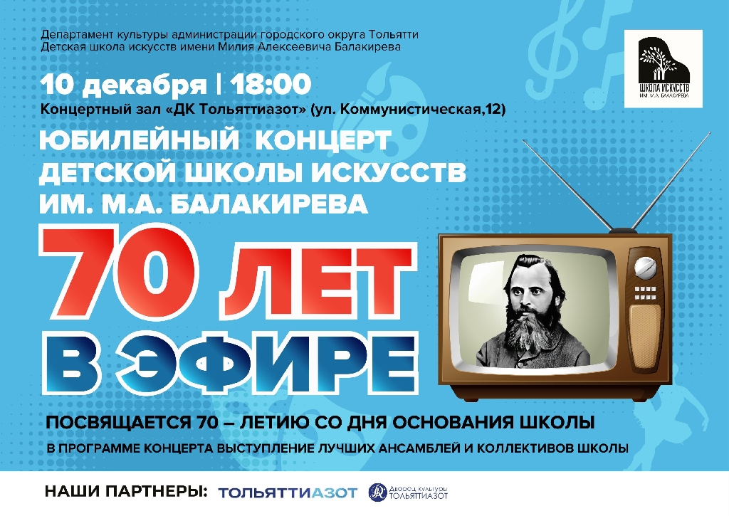 10 декабря 2025 года в ДК «ТольяттиАзот» состоялось торжественное мероприятие, посвященное 70-летию первого учебного заведения Ставрополя-Тольятти Детской музыкальной школы №1 (ныне Детская школа искусств им. М.А. Балакирева, образованная путем слияния ДШИ №1 и ДМШ № 7).