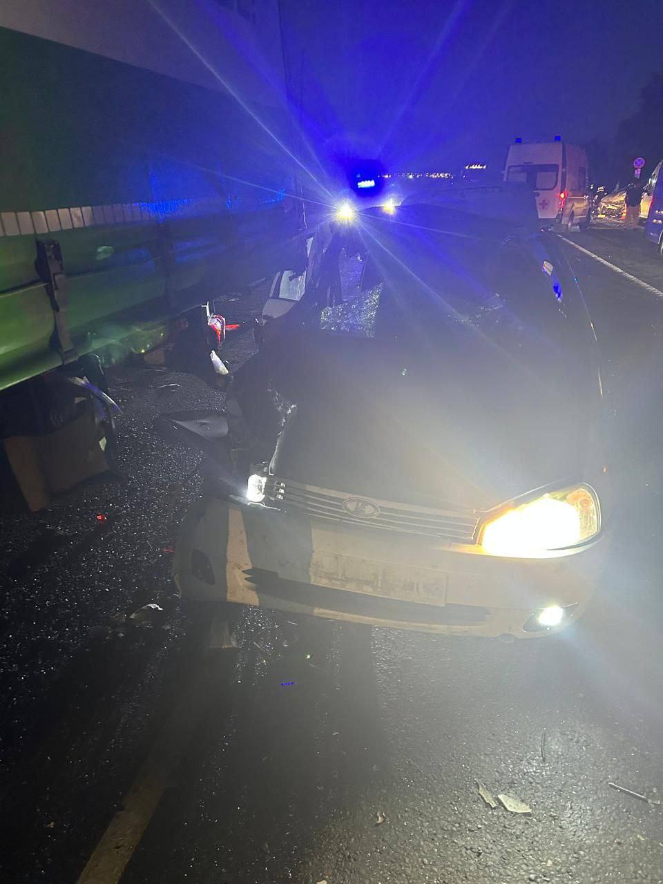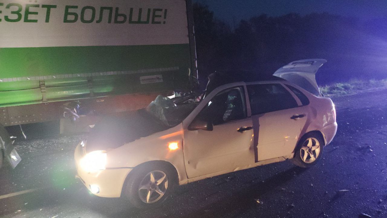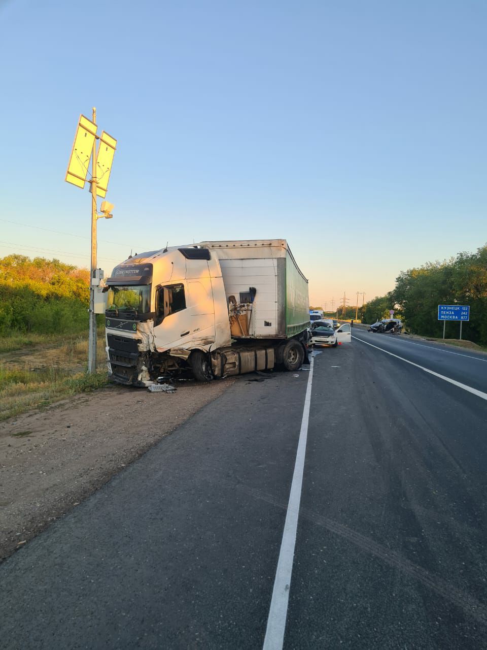Примерно в 2:50 на 876 км автодороги в аварию попали грузовик и две легковушки. По предварительной версии, водитель «Тойоты» выехал на встречную полосу, где произошло столкновение с грузовиком «Вольво», а затем с «Ладой Калиной», сообщили в прокуратуре Самарской области.