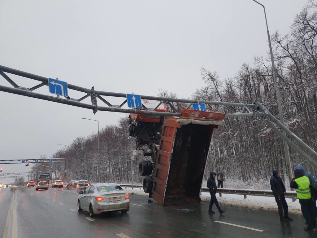 В полиции сообщили подробности необычной аварии, которая произошла утром 25 ноября на Волжском шоссе в Самаре. Там грузовик с поднятым кузовом встал на дыбы.