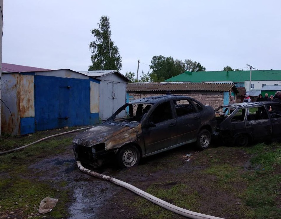 Сгорели 2 легковых автомобиля, а также некоторые постройки. Специалисты выясняют причину возгорания.