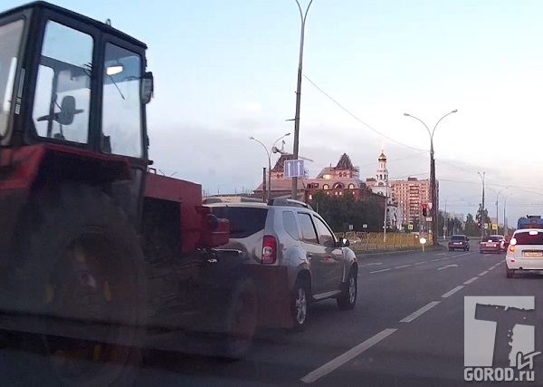 На улице Свердлова у перекрестка с Революционной колесный трактор – бульдозер ударил сзади внедорожник «Рено-Дастер». Как у него получился такой маневр, кто кого здесь подрезал и обгонял, очевидец аварии, приславший фотографии в редакцию, не сообщает. Судя по всему, пострадавших в этом ДТП нет.