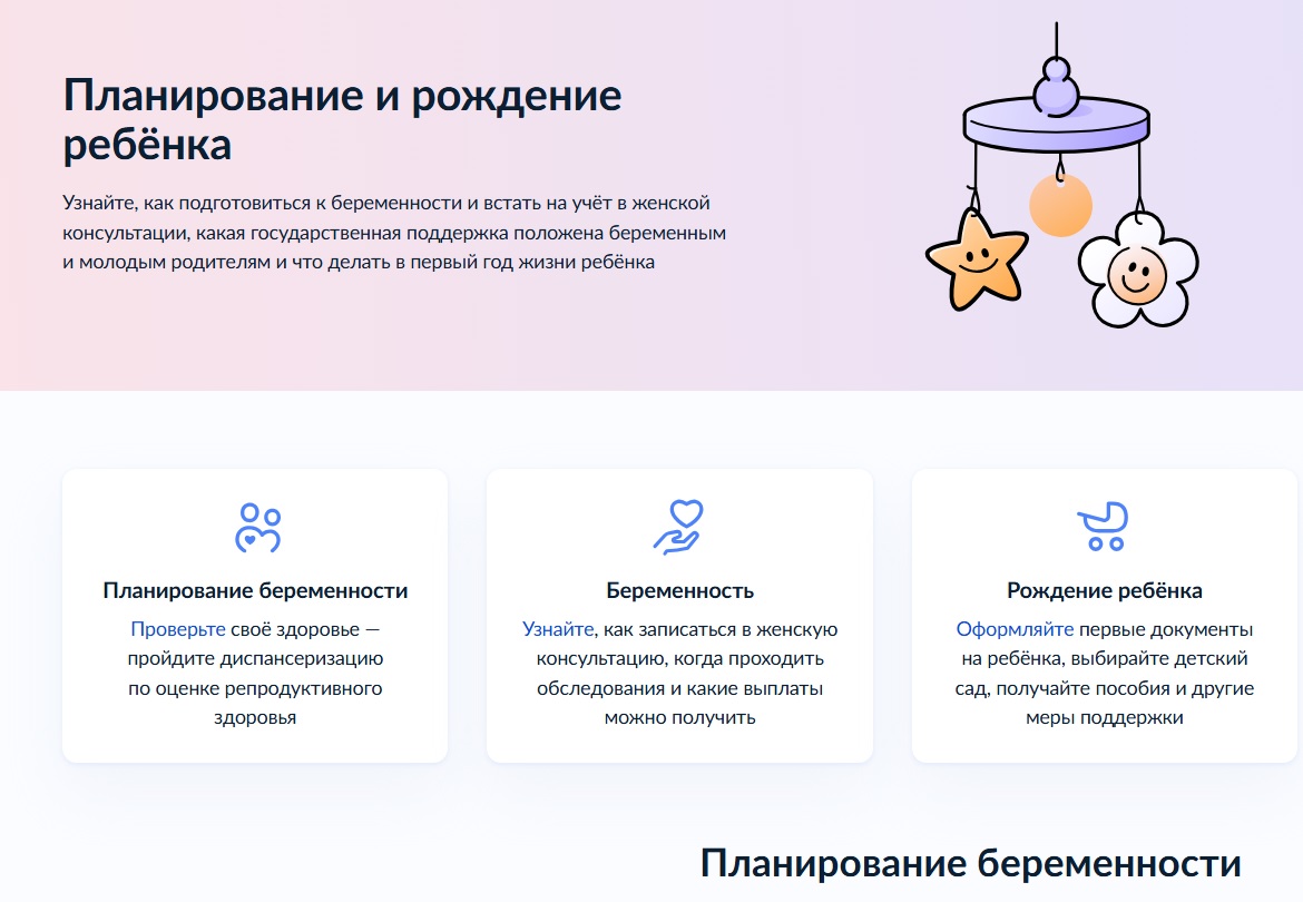 Жизненные ситуации помогают решать множество социально значимых вопросов. Например, жизненная ситуация «Планирование и рождение ребёнка» объединяет государственные услуги и справочную информацию, которые помогают молодым семьям и будущим родителям на разных этапах — от подготовки к беременности до оформления документов после рождения ребёнка. Сервис позволяет в одном месте получить сведения о медицинском наблюдении, мерах социальной поддержки, выплатах и пособиях, а также подать необходимые заявления в электронном виде.