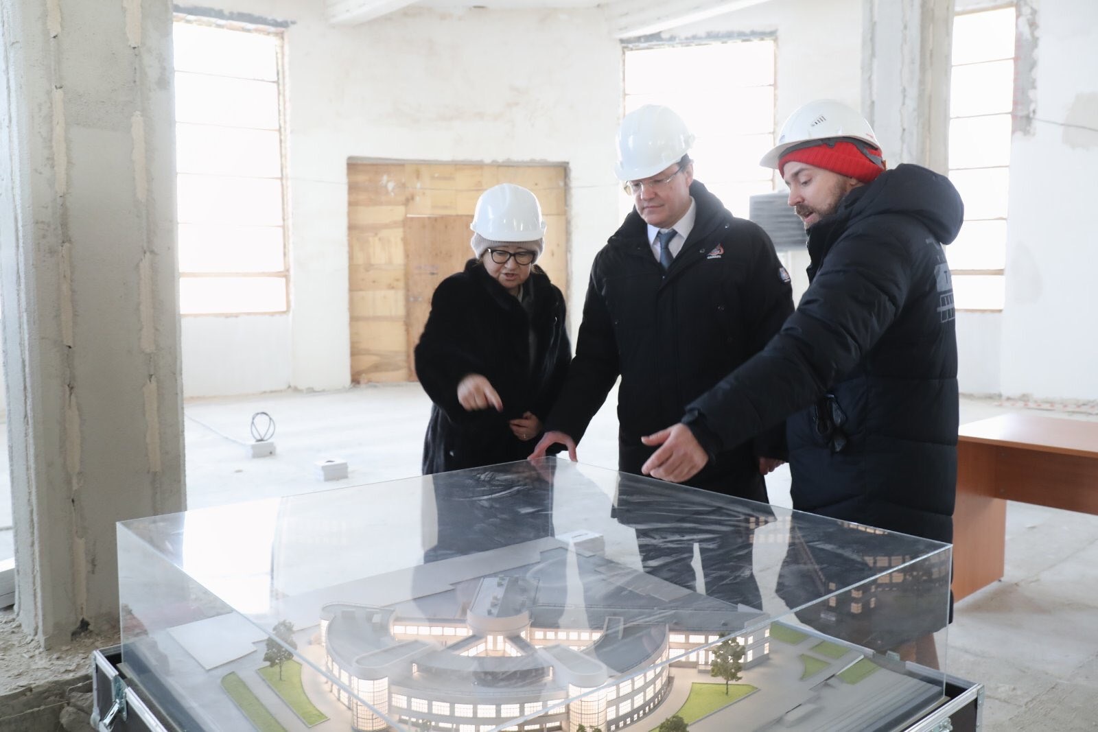 Во время осмотра директор областного филиала Третьяковской галереи Михаил Савченко рассказал Дмитрию Азарову и Зельфире Трегуловой, что на сегодняшний день на объекте завершены работы по усилению фундаментов и закрыт тепловой контур. Внутренние помещения обеспечены теплом, что позволило начать отделочные работы и монтаж коммуникаций, а также фасадные работы.