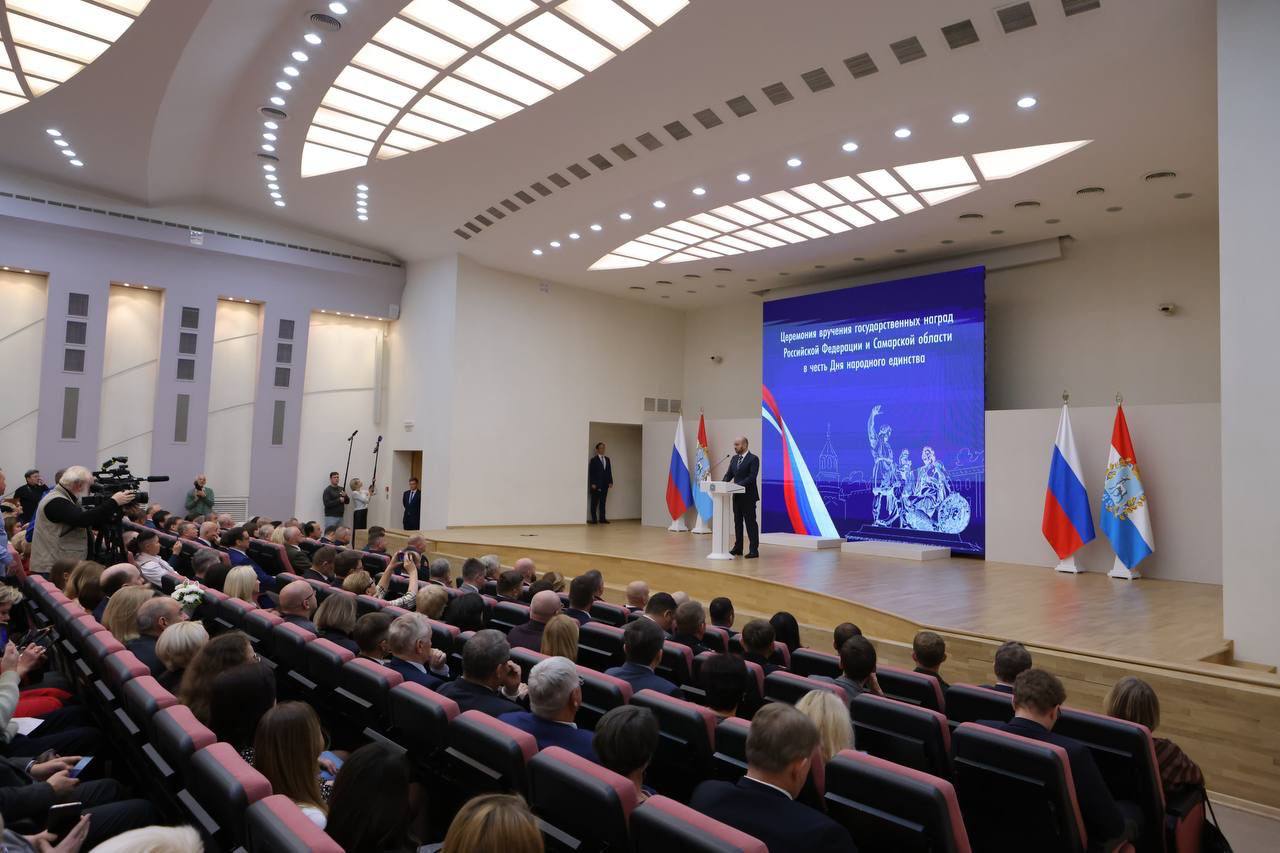 Губернатор обратился к участникам церемонии: «Вы — гордость Самарской земли, достойные продолжатели традиций своих дедов и прадедов, жителей запасной столицы. Каждый из вас, находясь на своем месте, вносит ценный вклад в преумножение благополучия нашей Родины. Мы собрались сегодня, чтобы поблагодарить вас за плодотворный труд, высочайший профессионализм, преданность Родине, готовность нести ответственность за ее судьбу, приходить на помощь своим землякам. Особые слова благодарности — сегодня и всегда — нашим военным, принимающим участие в специальной военной операции, которые сегодня также находятся в этом зале. Преклоняемся перед вашей невероятной храбростью и мужеством, которые вы проявляете в ходе выполнения боевых задач».
