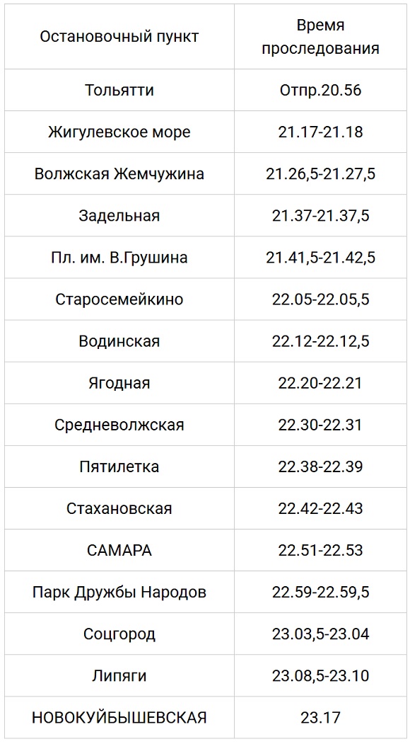 «Маршрут электропоезда «Ласточка» № 7130/7129 Тольятти (отпр.20.56) – Самара (приб.22.51) ежедневно устанавливается до станции Новокуйбышевская (приб.23.17)», — , сообщили в Самарской пригородной пассажирской компании.