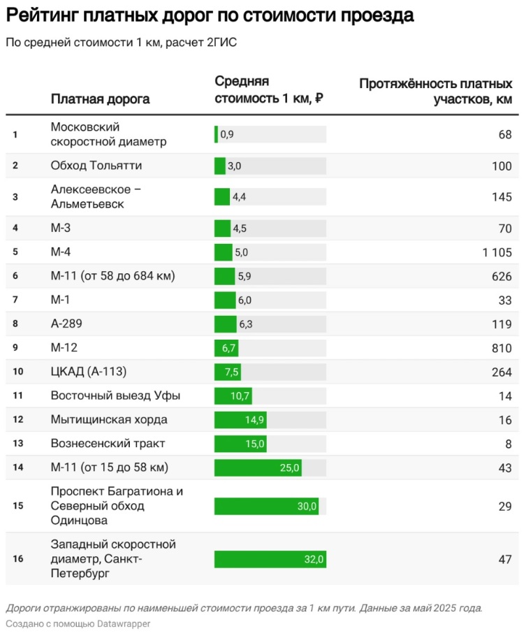 Подсчитывалась средняя стоимость 1 км таких трасс. В первой тройке оказались Московский скоростной диаметр (МСД) (0,9 руб. за 1 км), Обход Тольятти (3 руб. за 1 км) и дорога Алексеево — Альметьевск в Татарстане (4,4 руб. за 1 км).