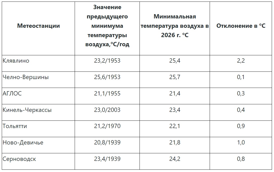 В Тольятти температура опустилась до -22,1 градуса. Был обновлен рекорд 1970 года. В Клявлино (-25,4) и Челно-Вершинах (-25,7) обновлены показатели, установленные в 1953 году. А в Новодевичье (-21,8) и Серноводске (-23,4) побиты рекорды 1939 года.