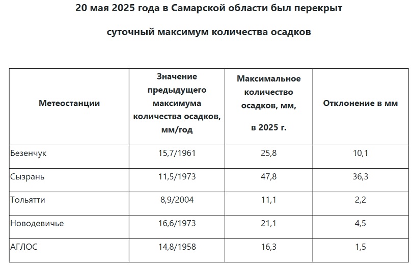 Так, в Тольятти в этот день был перекрыт суточный максимум количества осадков, установленный в 2004 году. 20 мая 2025 года в автограде максимальное количество осадков составило 11,1 мм (отклонение – 2,2 мм).