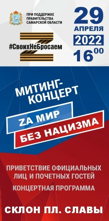 29 апреля в Самаре состоится всероссийский телемарафон «Zа Мир — без нацизма!». Мероприятие начнется в 16.00 на склоне площади Славы и пройдет в поддержку российских военнослужащих, которые участвуют в спецоперации на Украине.