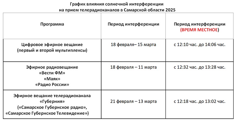 С 18 февраля по 15 марта с 12:10 до 14:06 в Самарской области возможны кратковременные помехи телеприему, вызванные сезонной солнечной интерференцией.