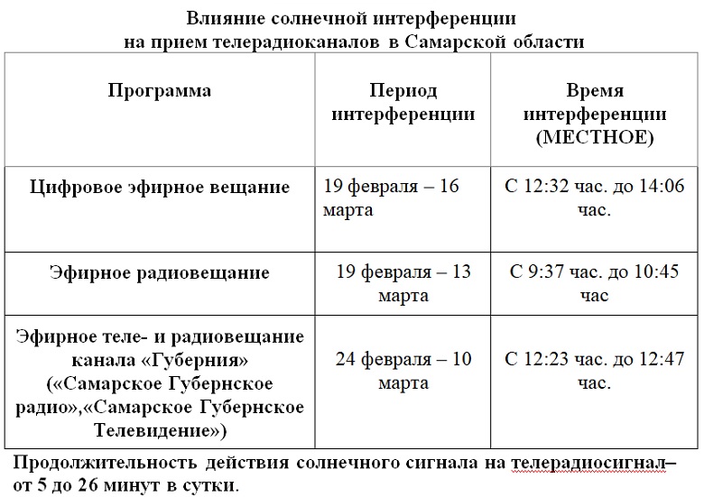 В Самарской области кратковременные помехи на экранах телевизоров из-за солнечной интерференции возможны с 19 февраля до 16 марта с 12:23 час. до 14:06 час. местного времени. Продолжительность помех в указанные даты и время — от 5 минут до 26 минут в сутки.